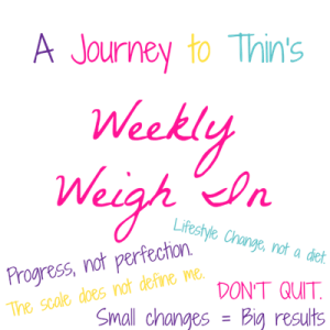A Journey to Thin’s Weekly Weigh In_thumb[2] Share this: Click to share on X (Opens in new window) X Click to share on Facebook (Opens in new window) Facebook More Click to email a link to a friend (Opens in new window) Email Click to print (Opens in new window) Print Click to share on Pinterest (Opens in new window) Pinterest Like Loading...
